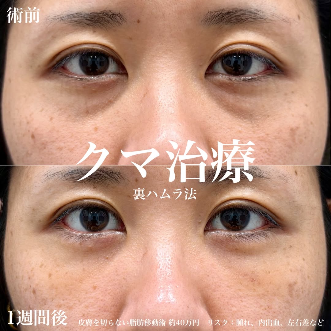 クマ取り治療の裏ハムラ法は、施術リスクで内出血、腫れ、左右差、違和感、クマの残存などがでることがあります。