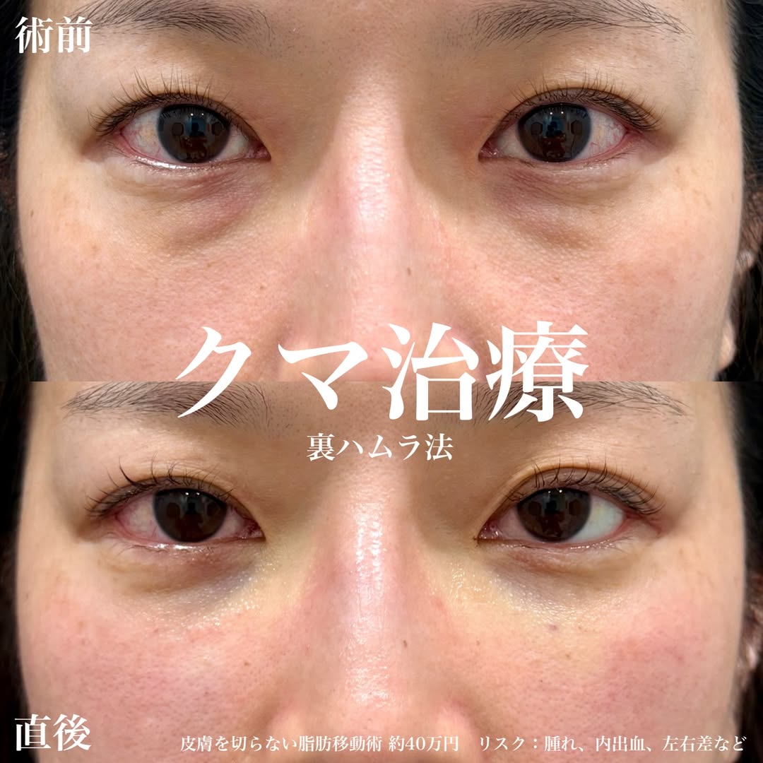 クマ取りは、皮膚を切らずに脂肪の移動をする裏ハムラ法による治療が最も有効です。